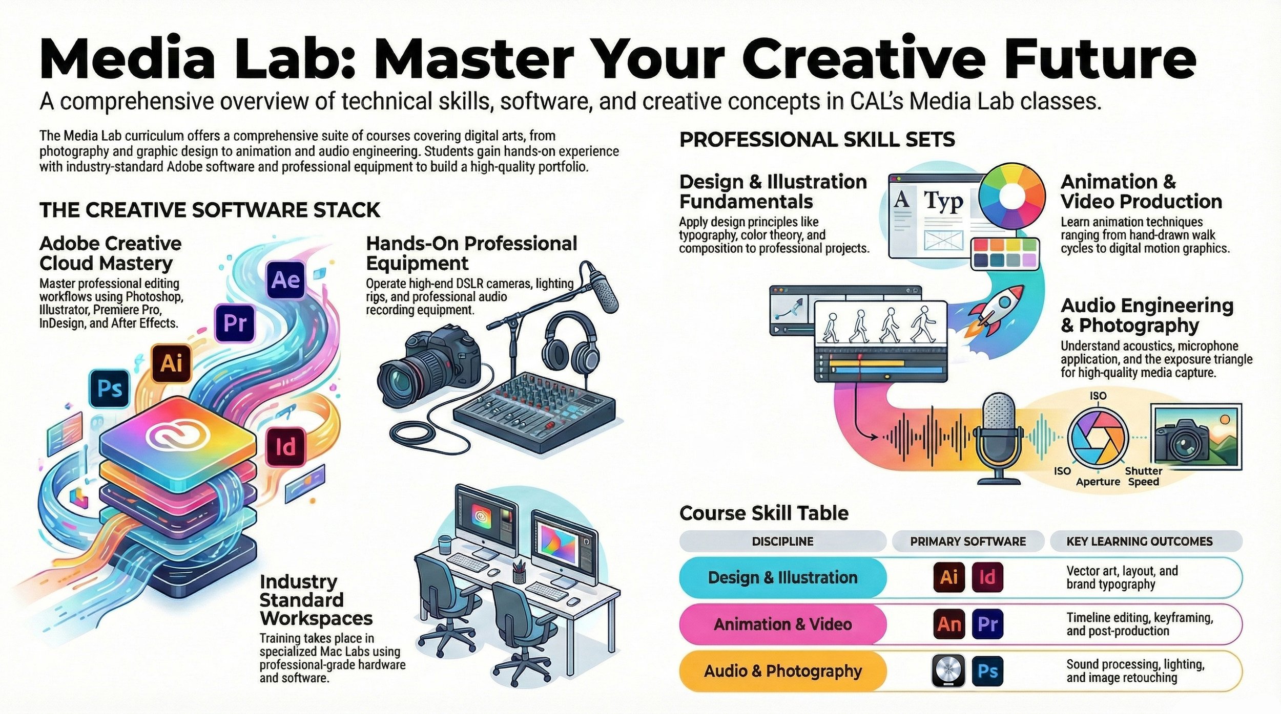 With constantly changing technology and ever-increasing reliance on digital content, the Media Lab program at CAL is poised to get students ready for a variety of careers in the creative services industries. In this hands-on program, CAL students learn techniques for image development; they capture, create, and edit video, audio, and photo files for media productions and projects. CAL Media Lab students practice design, animation, digital storytelling, photography, and videography for film, web, and other types of multimedia productions.