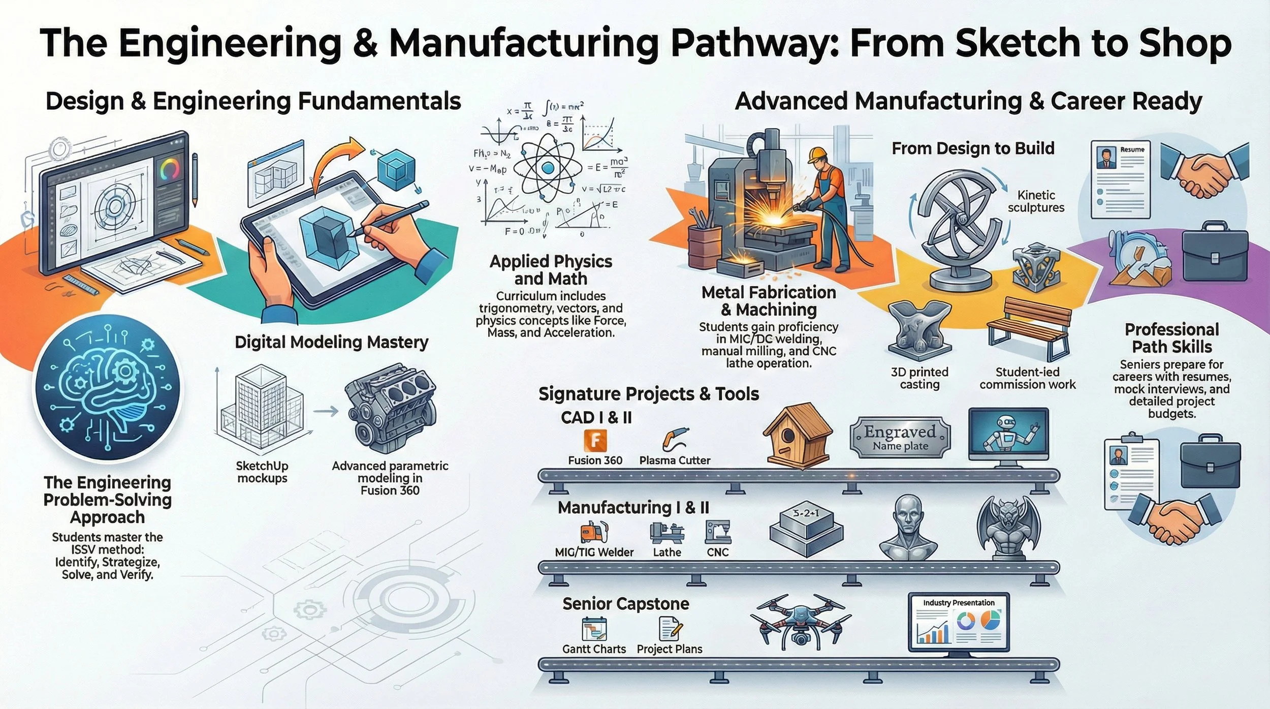 This program focuses on the Design-To-Build process, and the Identify, Strategize, Solve and Verify problem solving stages. Juniors learn CAD using Sketchup and Fusion 360, math and physics modeling. Seniors learn to lead a project from ideation to completion, advanced Fusion manufacturing techniques, and how to communicate professionally in email and voice with Industry Partners. In the shop, Juniors learn MiG welding (GMAW), manual machining, and 3D printing. Seniors focus on CNC, TiG (GTAW), turning (lathe) and casting. No prior shop experience required!